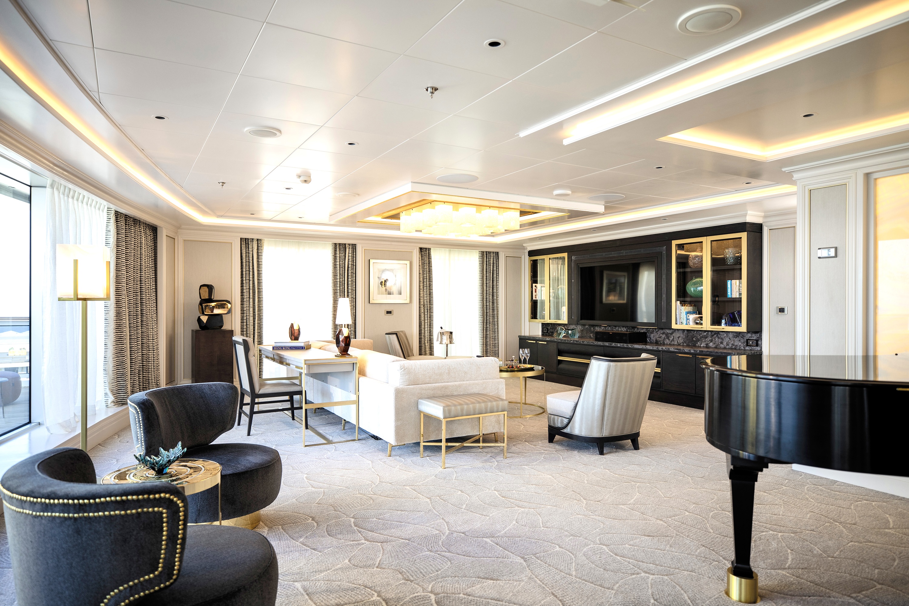 Overview: With 750 guests and 542 crew, the newest evolution of the Regent experience is an all-suite wonder, the very pinnacle of ocean luxury. And the Grandeur comes by her name honestly enough – expect unrestrained refinement in the form of seven restaurants, multiple bars to get comfortable in, a casino, a massive theatre, a culinary arts kitchen, and an Art Nouveau-style observation lounge. A redesign of the Compass Rose restaurant concept is one of the highlights, complete with a cascading waterfall incorporating a hand-blown glass sculpture.