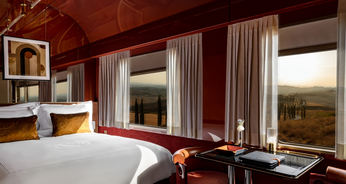 Within the train’s sleek lacquered walls lies a celebration of Italian modernism—polished brass, burnt sienna ceilings, smoked mirrors, and plush velvet details. From your cabin window, watch the sun rise over vineyard hills or shimmer off the sea.